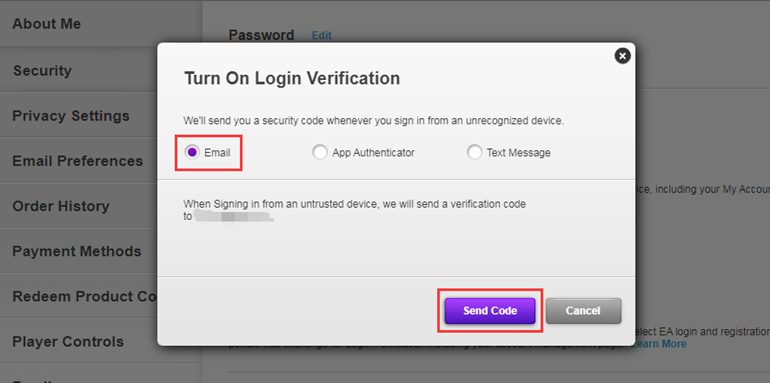4. Choose "Email", then click "Send Code".