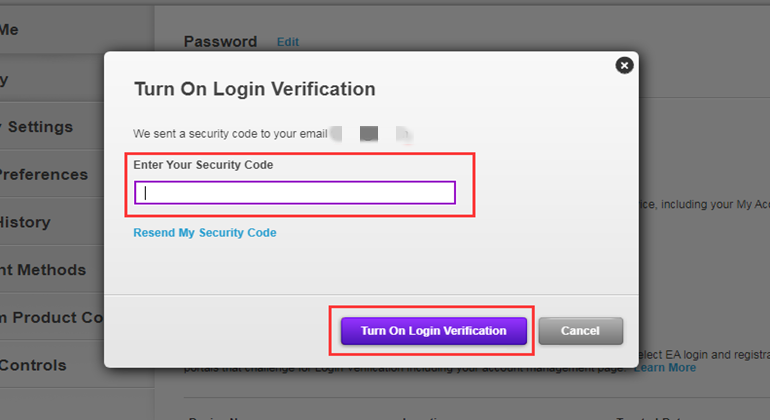 5. Type the security code you received in your email inbox, then "Turn On Login Verification".