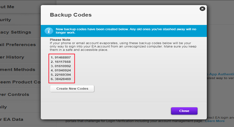 The backup codes you submit expired. Please log in to your EA account to create new backup codes and send them to us via live chat.