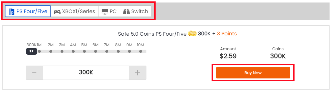 2. Select your console, then enter or select the coins amount you want to buy, and click "Buy Now".