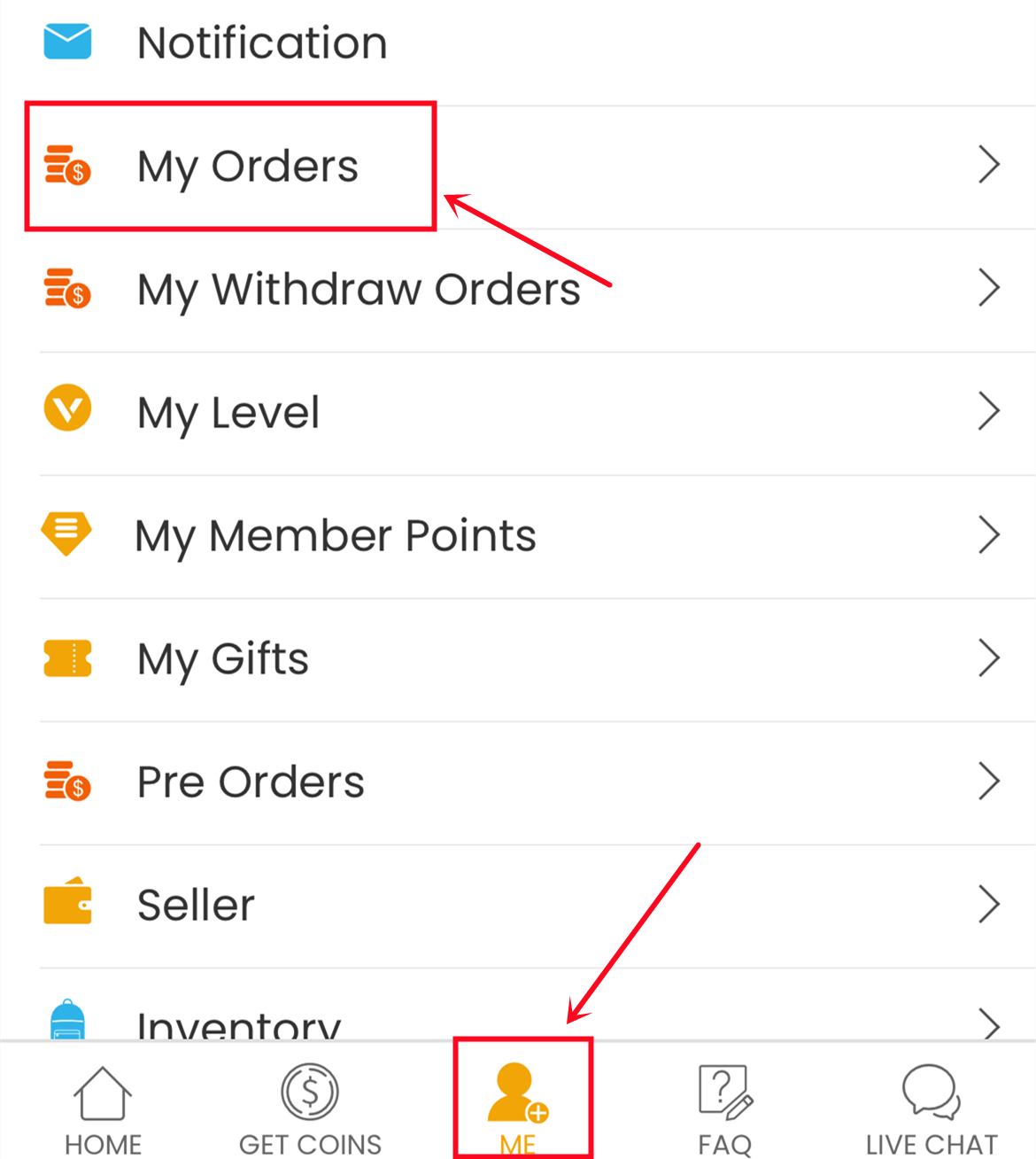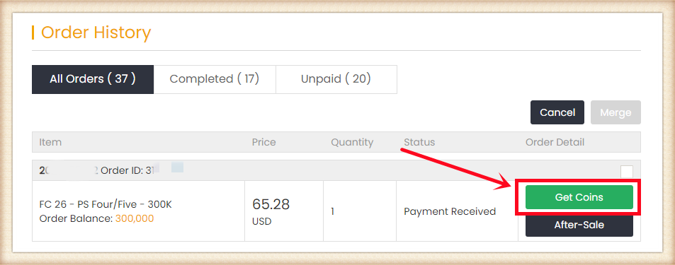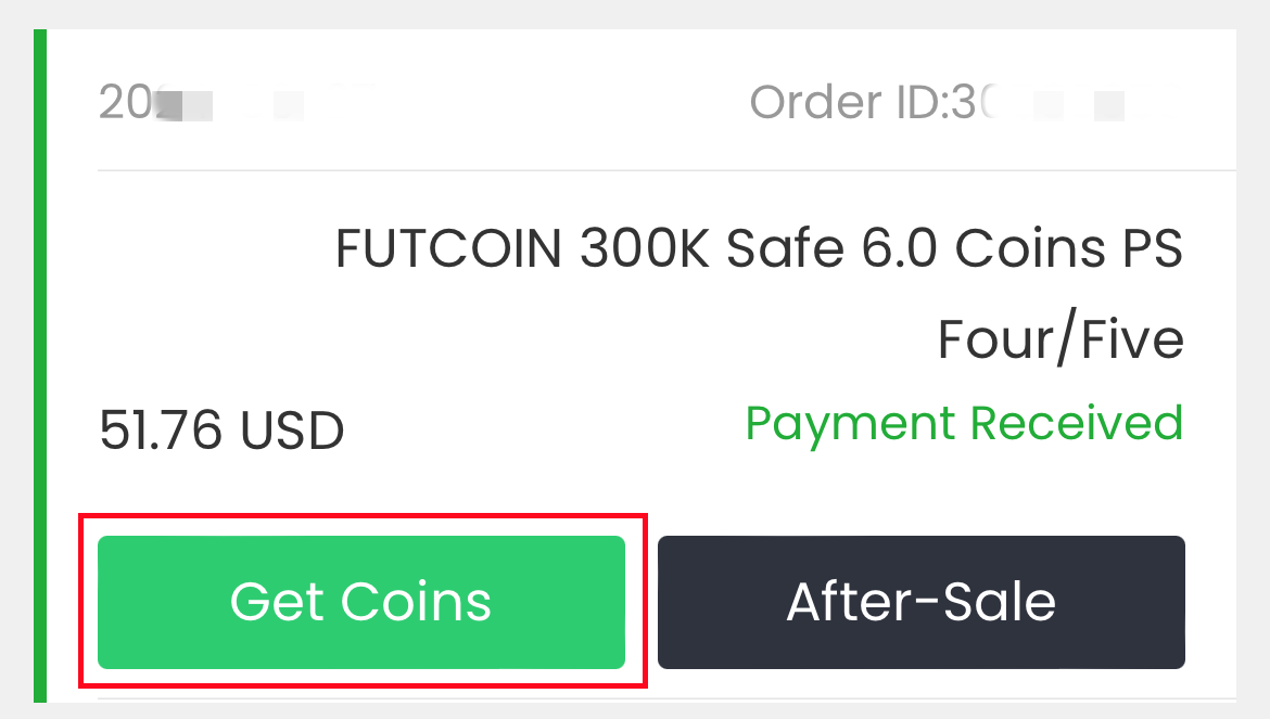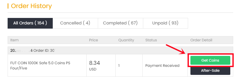 4. Haga clic en "Get Coins" en la parte superior derecha, busque su pedido y haga clic en "Get Coins".