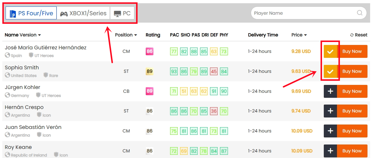 8. Our system will locate player cards automatically. Please confirm and choose the player card listed by you, then click "Buy Now".