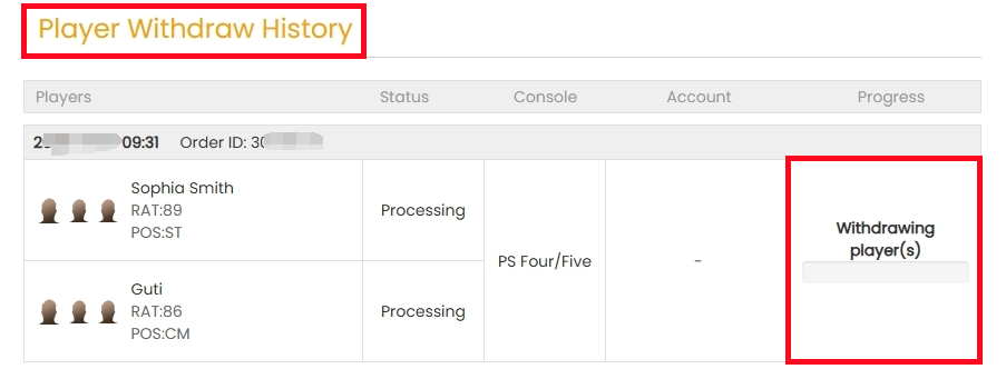 7. Verifique el estado de la orden de retiro en "Historial de entrega". Espere un momento hasta que compremos su tarjeta de jugador, luego inicie sesión para recoger sus monedas.