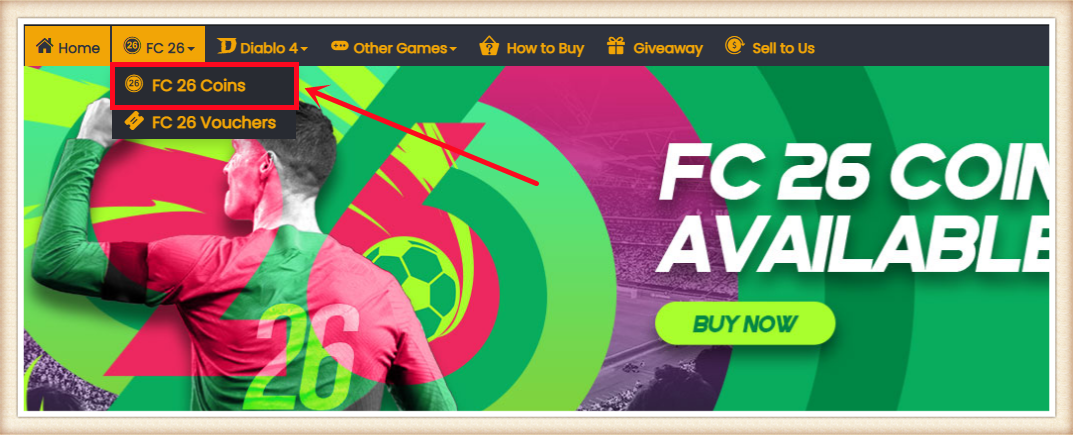 1. Inicie sesión en su cuenta de miembro antes de hacer un pedido, elija "FC 26" y haga clic en "FC 26 Monedas".