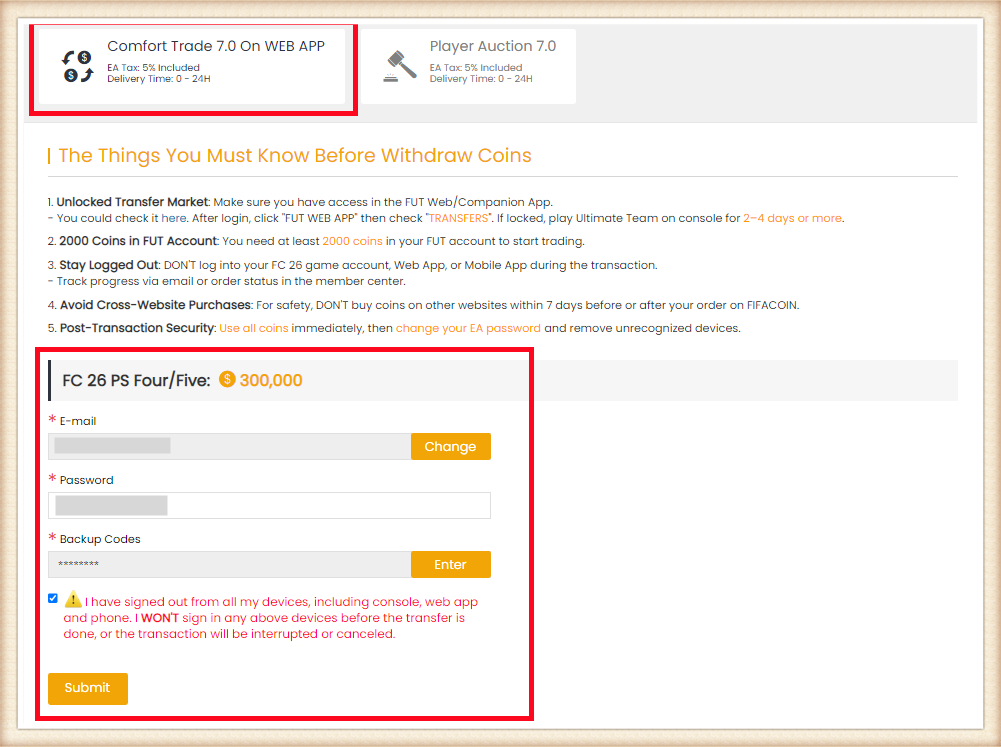 1. Please log in your FUT account and get 5000 coins at least. Having more coins will lead to faster and safer order fulfillment;