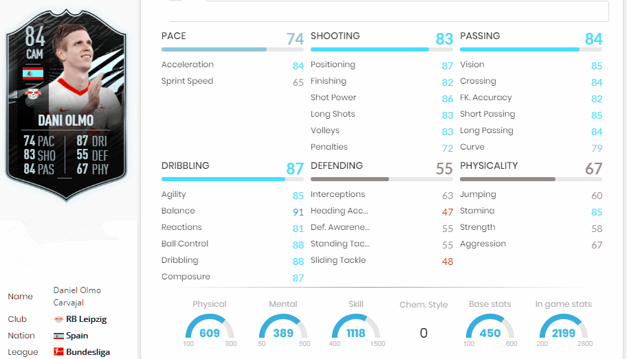 If you're looking for a strong option to bolster your FUT 21 Ultimate Team, unlocking TOTS Moments Dani Olmo isn't a bad idea. This 91 OVR rated center attacking midfielder has a 94 in Pace and Dribbling, a 90 in Passing, and an 88 in Shooting. Underneath, he's boasting a 99 in Balance, 99 in Acceleration, and 90+ ratings in Agility, Ball Control, Dribbling, Composure, Positioning, Shot Power, Vision, Crossing, Short Passing, Long Passing, and Stamina.