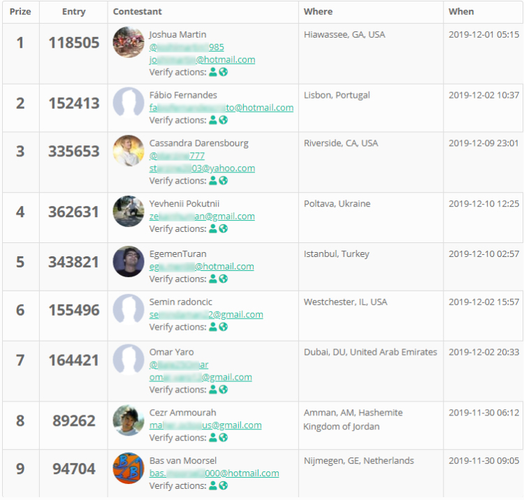 The winners are randomly chosen by the third party gleam.io according to their entries as long as the event ends. They are: